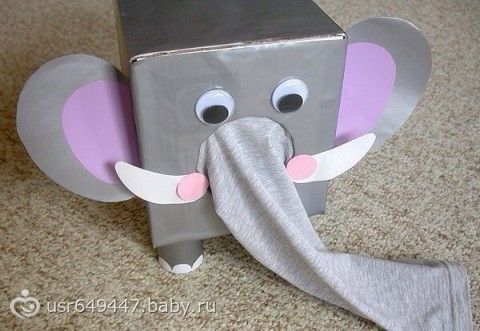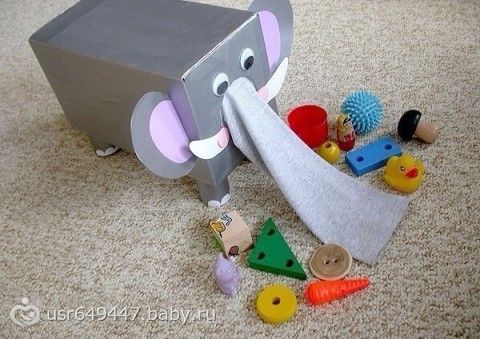 её проще-простого самому сделать. нужны всего-то: оберточная бумага подходящего цвета, коробка, рулоны от полотенец или туалетной бумаги для ножек слона, картон для ушей, два рукава от трикотажной кофты(для хобота и хвоста), нетоксичный клей, пара маркеров, игрушки-доставушки парные с хорошо ощупываемой формой и терпение)