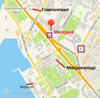 фиолетовым выделены остановки: одна у Гостиницы Москва (если автобус повернет на Горького), вторая непосредственно у Мелодии.так и есть, Навагинская как раз с Мелодии и начинается. просто ближе выйти у Гостиницы Москва. если хотите, можем вас встретить у вокзала. мы близко живем.