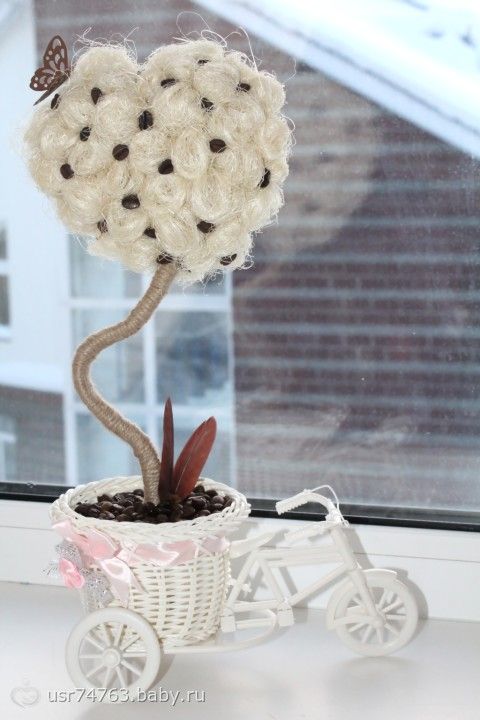 это топиарий, основу можно готовую купить, можно из картона сделать, а обклеивают основу в общем-то чем угодно: кофе, сухоцветы, бусинки… у меня шарики из сизаля бежевые и вкрапления зерен кофе)