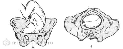 мерам таза уже средним косым размером (10 см), что делает роды при заднем виде более затяжными, После поворота головка устанавливается затылком кзади, а большим родничком к симфизу.