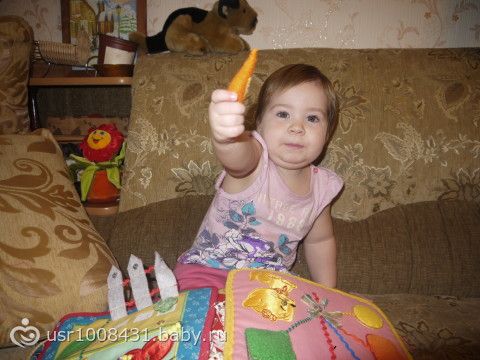 Книга для развития мелкой моторики у детишек от 10 месяцев до трех лет. Выполнена из ткани и различной фурнитуры. Элементы картинок крепятся на липучках, кнопках, замочках и пугвичках, что очень нравится деткам.