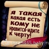 О себе: Упрямая-поэтому часто добиваюсь своего. Требовательная и к себе и к окружающим. Прямолинейная до жути, выскажу все что думаю, даже если буду понимать что могу тем самым обидеть. На ошибки указать можно только один раз. Потому что, если продолжаю делать так же: значит считаю это правильным и ХРЕН переубедишь. Не люблю лжи. Но умею прощать всё. Никогда не откажу в помощи! И за своих загрызу! В любви странная: могу любить всей душой, но не говорить об этом. Я не верю в слова… мне нужны действия… Верность только в отношениях. В другом случае либо всё, либо ничего. Умею и буду бороться из последних сил за своЁ счастье. Иногда задаю себе вопрос: почему я не такая как все? Я Козерожка, рожденная в год тигра, наверное, поэтому во мне уживается спокойствие с бунтарством. На первый взгляд — ангелочек, но если задеть за живое пиши, пропало… ВОКРУГ ВСЕ ЛЕТИТ В ПУХ И ПРАХ!!! АААААААА!