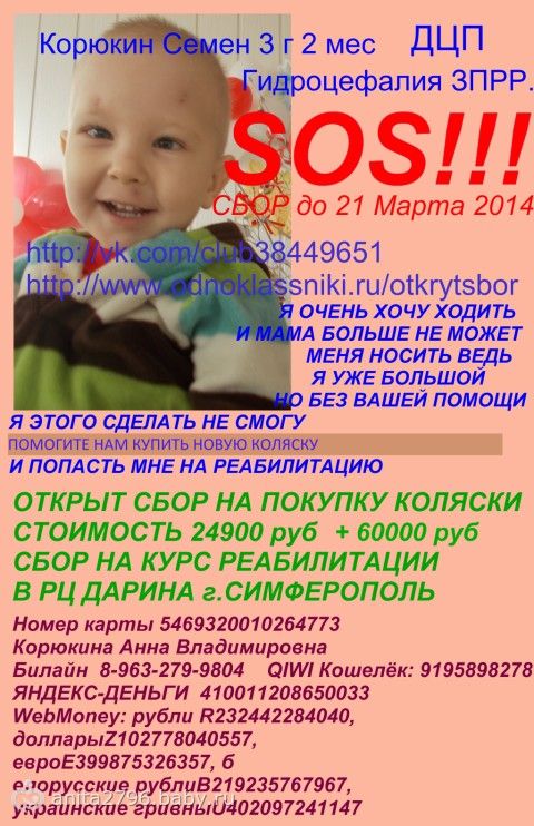 Не ходит, сам может только садится, пытается ползать. Семену предстоит курс реабилитации РЦ ДАРИНА г.Симферополь. Нужна спец.коляска. Сумма к сбору 84900. на 4 февраля собрано 6731,16 руб, собрать осталось 78168,84 руб до 21 марта 2014г.