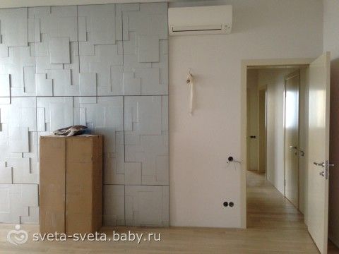 3D-панели купили в серебре, т.к. рабочие орали что им срочно! Я беременная по жаре моталась на варшавку и заказывала их. В Москве были только в серебряном цвете. Думали до родов закончим ремонт и решили перекрасить короб в синий, чтобы с панелями голову не морочить… Только цвет стен немного не подошел. Даже на это глаза закрыли… Итог. панели простяли на полу! до сентября!!! Родила я в 19 июля… как видишь, наши чудо рабочие повесили их с огромными зазорами… теперь надо ломать крепления и отдирать их от стен… Жесть!Вот как должно было быть: