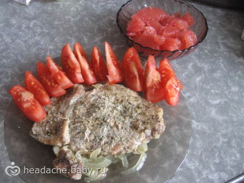 Обед 14:00: Свинина запеченная в фольге, помидор, грейпфрут.