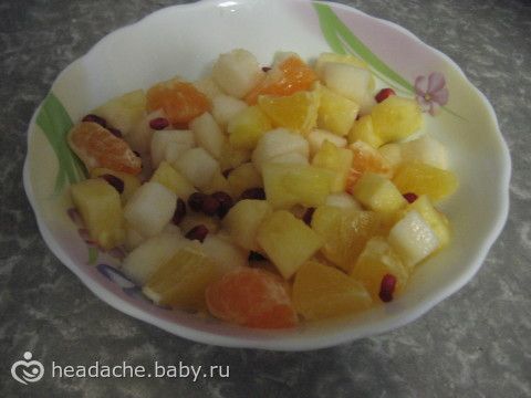 Ужин 19:00: Фруктовый салат (мандарин, апельсин, ананас, красная груша, гранат).