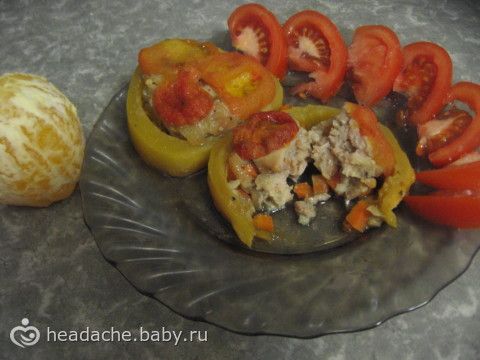 Обед 14:00: Кабачок фаршированный (курица, морковь, лук, чеснок, соль, перец), сверху помидорка, половина свежего помидора,1 апельсин.