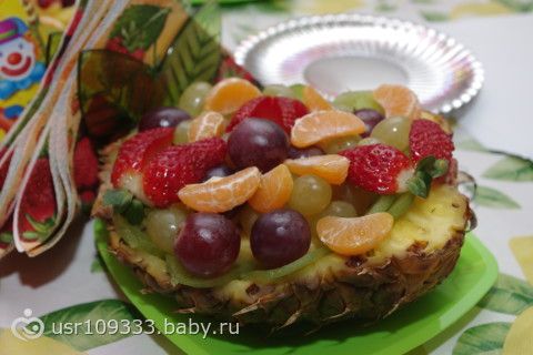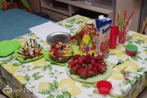 Мама помогла мне с готовкой. Сделали канапе фруктовое, и лодочки из ананаса. Клубника была с растопленным молочным шоколадом… детки были в неописуемом восторге! Ну и пиццу я приготовила.