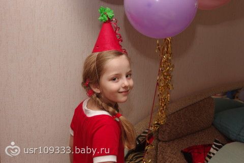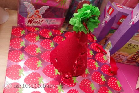 Я решила дополнить Сашин образ шапочкой специально для неё сделанной (обклеила салфетками и помпон из гофробумаги привязала на ленточки)