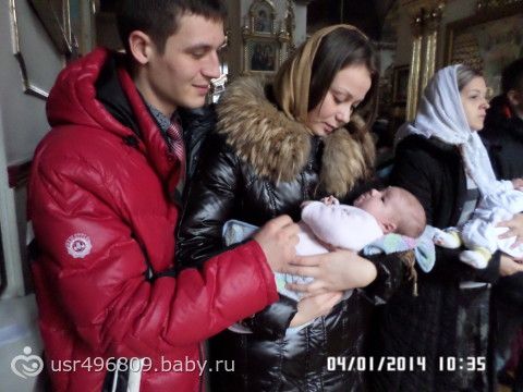 По поводу крестин в нашем доме проходили «жаркие битвы», так как я хотела дождатся потепления, но моя мама была не возмутима: КРЕСТИТЬ НАДО ЧЕМ БЫСТРЕЕ ТЕМ ЛУЧШЕ!!! под ее напором я и сдалась! Крестины прошли 04.01.2014=) на удивление спокойно и быстро) Я ожидала худшего, малышка ни разу не заплакала… Слава Богу в этот день было тепло! Так что все остались довольны)