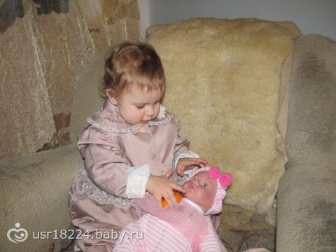 Она научилась всему, что нужно к годику — стоять, ходить, говорить))) Всё по чуть-чуть) Очень ласковая девочка, братья в ней души не чают!!! Играют с ней, балуют. На день рождения я подарила ей куколку-пупса, а папа с Веней большую пирамидку, старший брат — сортер-уточку) Вот такие простые подарки.