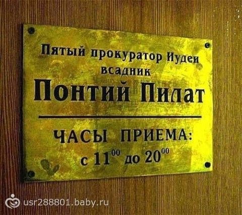 Где принимает Понтий Пилат?))) 16 февраля 2014 01:09 где это? кто скажет Комментарии Пожалуйста, будьте вежливы и доброжелательны к другим мамам и соблюдайте правила сообщества ПожаловатьсяСкопировать ссылку Зуля Марат31 годШамиль12 лет Махачкала не хотела бы я быть там, где он принимает ПожаловатьсяСкопировать ссылку Евгения Александр19 летВладимир11 лет Санкт-Петербург Там же, где и Палата №6:)))))))))) ПожаловатьсяСкопировать ссылку одинокаяВолчица Москва ПожаловатьсяСкопировать ссылку Алёна Данечка13 лет Петрозаводск В романе Мастер и Маргарита) ПожаловатьсяСкопировать ссылку ОтчаяннаяДомохозяйка Чемпион21 годСандра13 лет Киев на том свете может? Предыдущая статьяКрем "БУРЁНКА". Как он?Следующая статьяСрочно! 9 недель, пошла кровь! Раменское!Актуальные постыраскраски для успокоения нервовкак мило назвать беременную