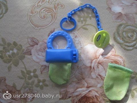 В эту сеточку можно ложить яблоко, печеньку, банан и т.д., и получается ребенок сосет ее, а подавиться не сможет.Раньше нам наши мамы в марлю заворачивали, а сейчас вот такая вещь уже есть.Девочки в Астане такие продаются в Акботе.Может кому пригодится, лично я не знала что такие есть