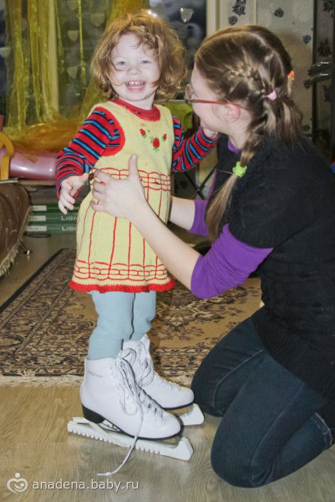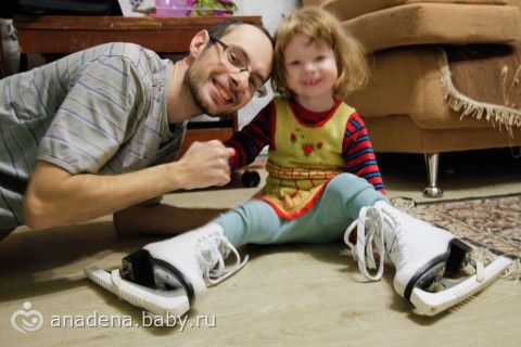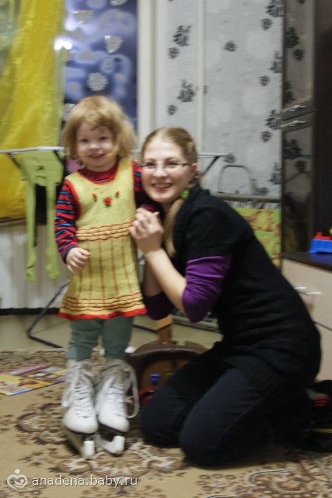 только я их вытащила, дочь подошла, «кони» и тычит в телек, а там фигурное катание — танцы на льду. я говорю, да там фигуристы катаются. она — и я! просит одеть коньки. одела. полчаса мы с ней ходили по комнатамона ходит и приговаривает — катииии.