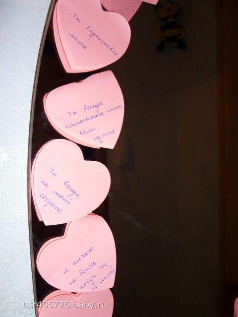 Решила написать о сюрпризе для мужа на день влюблённых. Хотелось удивить его, сделать такое, чего ещё не делала для него. Купила постики сердечком и написала на каждом 33 причины моей любви к нему. Писала искренне, от сердца. Наклеила их в коридоре, напротив входной двери, чтобы когда он зайдёт первое что он увидел были бы эти признания. В центре зеркала я написала самую главную причину — ЛЮБЛЮ ТЕБЯ, ПОТОМУ ЧТО ТЫ ОТЕЦ НАШЕГО РЕБЁНКА.