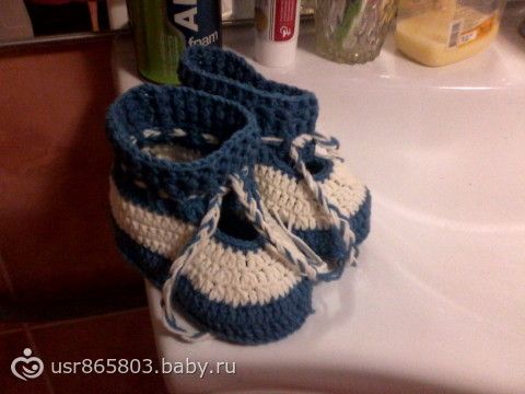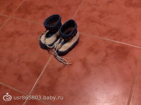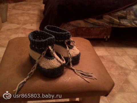 кто из подруг моих помнит что моя кума -сестра была беременной третьим малышом… на УЗИ ей сказали будет мальчик, ждали мальчика потом за день до родов сделала УЗИ подтвердить правильное положение плода (всю беременность сидел на попе ) сказали девочка у вас… вот поехала рожать а родился все таки мальчик… но не важно — главное здоров и перед самими родами повернулся головкой, умничка пожалел маму… родился у нас мальчик 3070 гр… хорошенький масик… жаль что мои критические дни не пустили их проведать но подарочек я уже приготовила… связала вот такие пинеточки… с размерчиком не угадала и вдогонку связала еще одни меньше а эти будут на вырост