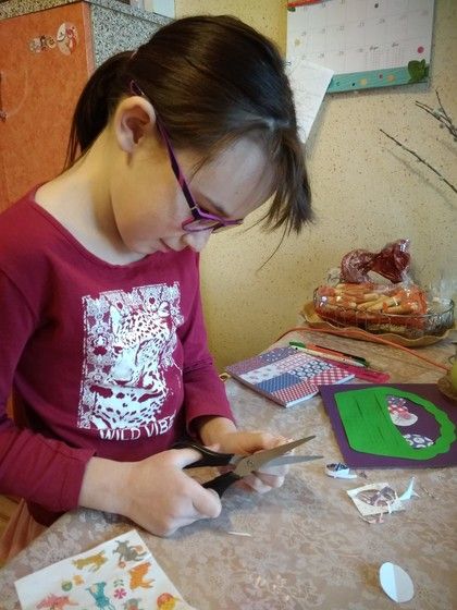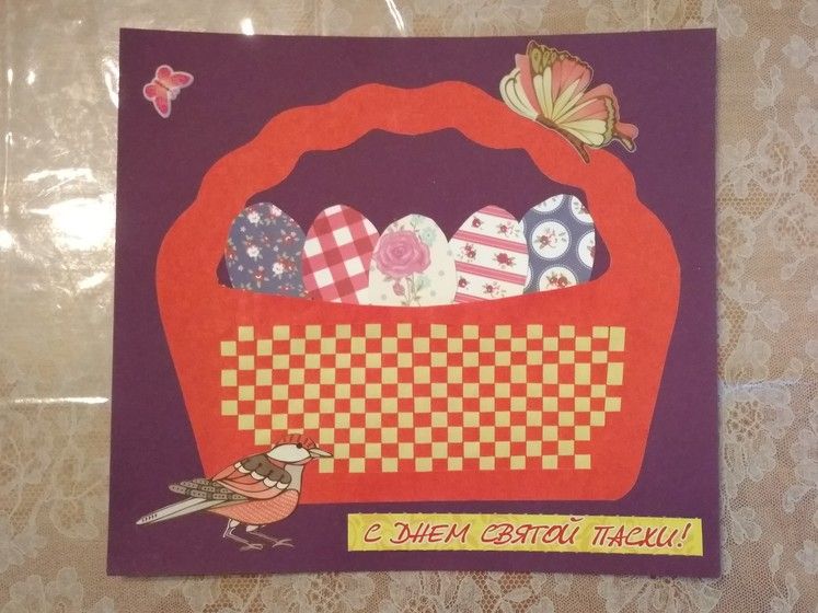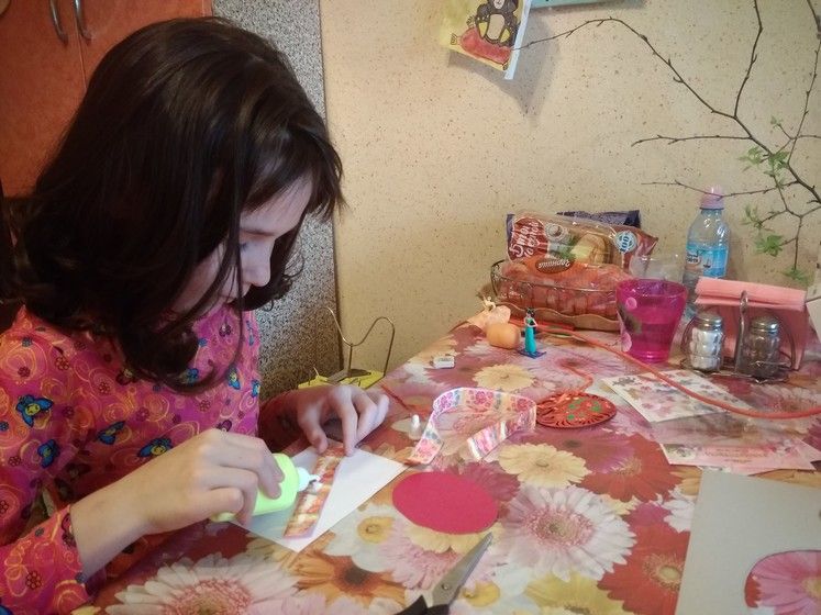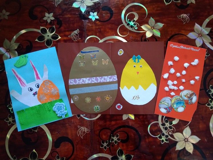 Затем сделали открытку бабушке. Наши прошлые мы как раз сфотографировали, когда были в деревне в последний раз.