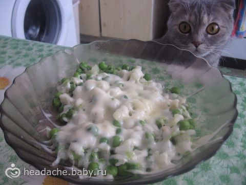 Обед. Зеленый горох, цветная и брокколи капуста там проглядывались, вареные. Сверху натерла сыр, прогрела в микроволновке.