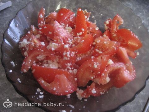 Ужин. 2 помидора,1 ст. ложка творога, чеснок, соль.