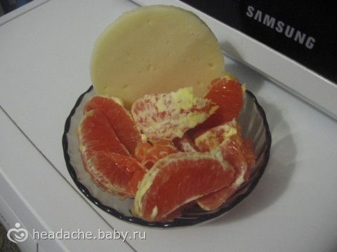Поздний ужин. Кругляш сыра и непонятно какой фрукт! Покупала вроде апельсины, снаружи выглядит как апельсин, а цвет как у грейпфрута, и вкус как у сладкого грейпфрута. Только пленки совсем не горькие. Странно… Это останется для меня загадкой