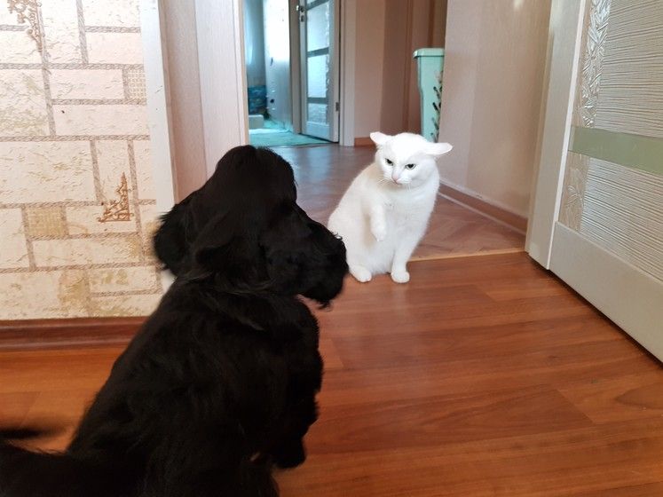 Муська с Никой все еще не подружились, хотя уже отношения чуточку теплее стали. Сначала Муська дико боялась, шипела, а сейчас уже порой терпит, что Ника ей ухо грызет, и даже один раз ели из одной миски. Очень интересно наблюдать за развитием их взаимоотношений