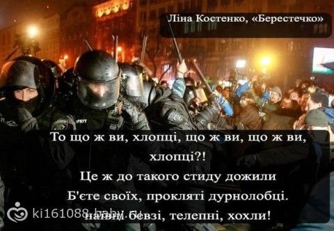 Это вы полоумная если такие выражения кидаете против своего народа! А войны никто не хочет и это выше любимое правительство начало нападать на людей обычных!!! Мне жалко людей которых отстреливают как собак снайпера, жалко тех кого беркут с калашникова в упор убивает, жалко тех студентов которые 30 ноября стояли с мирным митингом, а их силовики до полусмерти безоружных избивали!!! А если вы смеетесь с этого и вам так весело со всего происходящего, то у вас «мадам» нету сердца!!! А у меня оно каждый день болит за тех людей, которые стоят за нашу свободу и погибают там!!! И мне очень жаль, что в нашей стране живут такие «украинцы» как вы!!!!!!!!!!
