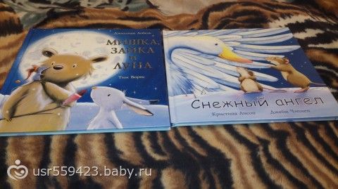 Какие замечательные книги. С Игорем сразу сели вместе смотреть. Иллюстрации супер. Конечно, как я и думала, больше Игорю понравилась книга «Мишка, зайка и Луна» (увидел в окно луну и теперь все книги с луной любит). Эх, жаль на видео никто не снимал реакцию ребенка, его возгласы «ОООО», «УУУУУ», «ЭЭЭЭЭЭ». Вторая книга «Снежный ангел» уже поспокойнее)))