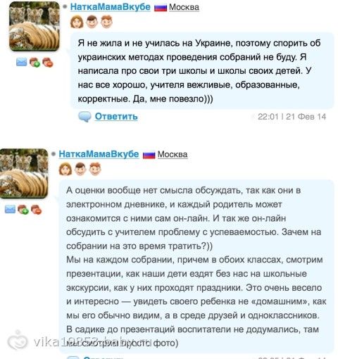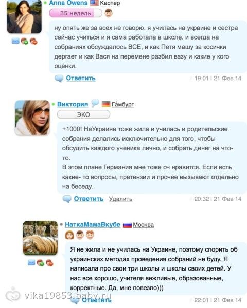 Была в октябре прошлого года на собрании у племянника в немецкой школе. Понравилось многое, в том числе и обсуждение личных проблем ребёнка (невнимательный, несобранный, отвлекается...) наедине. Понравилось, что преподаватель высказала предложения по совместному решению проблемы, типа я в школе делаю это, и вы дома придерживаетеся такого же курса, месяц нпблюдаем, есть результат, продолжаем в том же духе, нет результата, значит разрабатываем другую тактику. Не понравились некоторые мамы, которые перешёптывались на последней парте, но уж слишком громко. На них отвлекались много раз и делали им замечание((((
