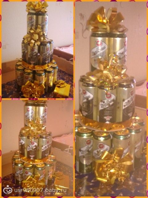 Вот и я насмотрелась в интернете на идеи подарков к 23 февраля и решила сделать «пивной» мужской тортик для своего любимого=) Не знаю сколько времени он конечно будет пить такое количество пива… думаю будет хороший повод позвать его друзей)) (отдельная история — как на меня смотрели с магазине, беременушка такая и пиво с полки сметает))хорошо подруга была рядом)))