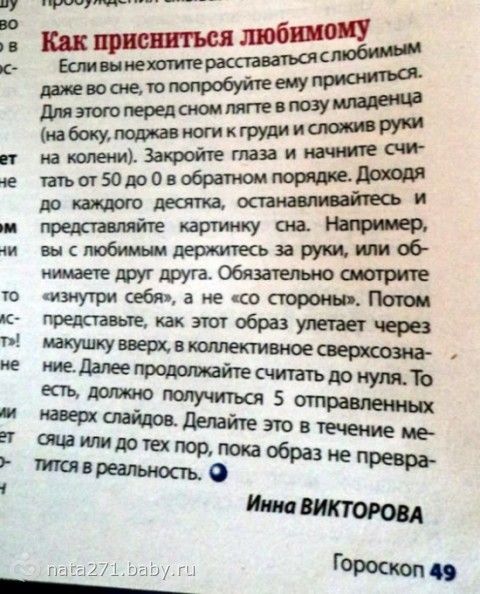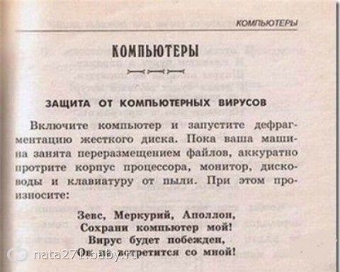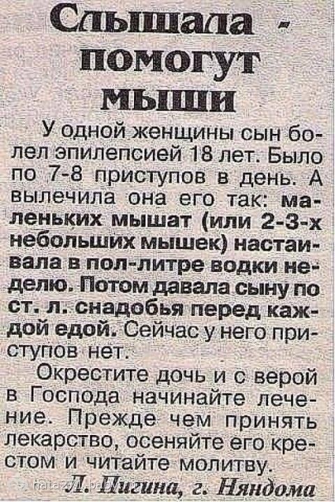 )))))))))))))))) 22 февраля 2014 22:29 Комментарии Пожалуйста, будьте вежливы и доброжелательны к другим мамам и соблюдайте правила сообщества ПожаловатьсяСкопировать ссылку БрысьКа Владимир18 летАртём12 летЭрика11 месяцев ПожаловатьсяСкопировать ссылку Симба Абуталиб16 летНуриман12 лет Тараз офигетьььь...))) а сотку наверное тоже можно лечить молитвой, если завирусован...)) ПожаловатьсяСкопировать ссылку ОченьЗлаяФуфа Вероника31 годЕкатерина30 летПавел28 летВиктория13 лет Киев ВО до чего довела людей медицина, что даже мышами лечатся! А про комп. вирусы вообще улет! — Надо мужу будет рассказать! ПожаловатьсяСкопировать ссылку Марина Рындина Светлана19 летМаргарита11 лет Киров ПожаловатьсяСкопировать ссылку Юлия Александра12 летКонстантин8 лет Ростов-на-Дону а еще можно трехнедельные портянки настоять, но это от всех болезней, так сказать универсалка!ПожаловатьсяСкопировать ссылку Зануда Туся Мамсик24 годаСтарший28 лет шИкарно ПожаловатьсяСкопировать ссылку КотШредингера® а я еще видела в какой то газетке, что эпилепсию лечат топлеными дождевыми червями)))))))))))) — в жестянке их надо нагреть до жидкостии от радикулита надо закопаться по горло в куче навоза)))реально! газета называлась что то типа «Айболит»… у первой свекрови видела))ПожаловатьсяСкопировать ссылку Зануда Туся Мамсик24 годаСтарший28 лет еще мокриц (жуков таких) тоже и настаивают и так прикладывают и едят в лечебных целях заходи в продолжение ПожаловатьсяСкопировать ссылку КотШредингера® я сейчас семечки грызла… по новому на них посмотрела))))))) ПожаловатьсяСкопировать ссылку Зануда Туся Мамсик24 годаСтарший28 лет ржу в голос ПожаловатьсяСкопировать ссылку Лариса Омск жесть какая, особенно про мышей и вирус в компе ПожаловатьсяСкопировать ссылку Зануда Туся Мамсик24 годаСтарший28 лет да как же без молитвы комп то включать ПожаловатьсяСкопировать ссылку Лариса Омск точно ПожаловатьсяСкопировать ссылку Лана Вайс Котенок12 лет15н Воронеж )))))))))))))))))))))))) ПожаловатьсяСкопировать ссылку СыновМать Мой22 годаТожеМой12 лет Круть)Уже прищепки считаю… И чтоб непременно разного цвета))) Предыдущая статьяКалендарь друзей и врагов.Следующая статья))))))))))))))))) Часть вторая.Актуальные постыовощной салат с кальмарамиболь под левым ребром