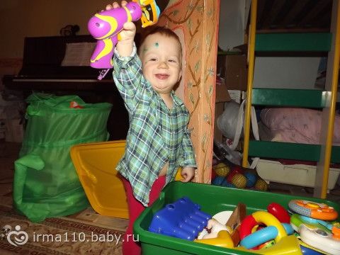 Сегодня мне и радостно, и немного грустно. Радостно оттого, что сын уже так подрос. Вес примерно около 11 кг, забыла взвесить сегодня. Он очень сообразительный мальчик. Любит рассматривать с кем нибудь книжки. Умеет строить домик из 3 кубиков, еще и зверюшку какую-нибудь наверх прилепит. Пирамидку собирает. Мячик бросает далеко, попадает им с метра в коробку. Любит щелкать выключателями, играть на пианино и синтезаторе. Все электроприборы с кнопками — магнит для него. Берет игрушечный пистолет и стреляет в девчонок, если не поддаются, ползет и прикладом бьет. Это его папа научил, чем очень гордится