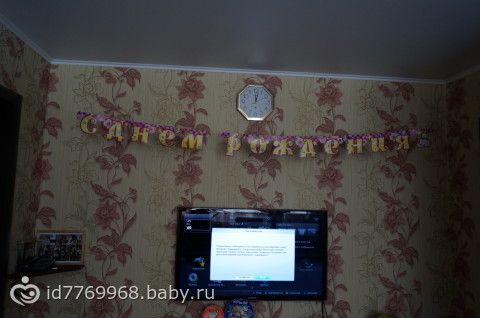 В пятницу весь день готовила, именинница пошла гулять со свекровью на часок (третий раз за год.И кстати, что удивительно, мне хватило дня — все сготовить, посидеть, полежать, сходить к соседке на час, а вечером начали украшать всем семейством комнату. Вот так украсили.