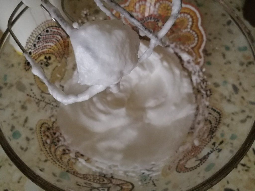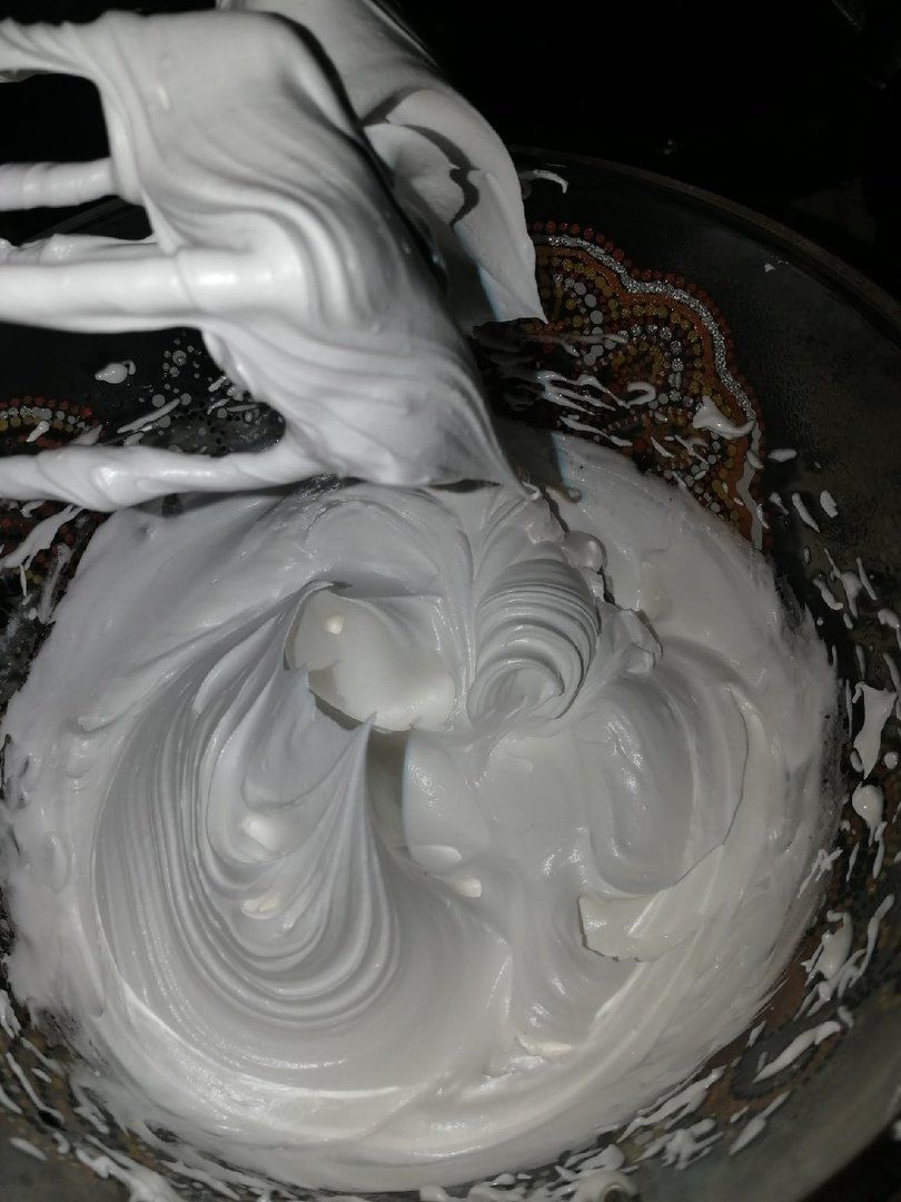 Затем заливаю тонкой струйкой сироп в белок постоянно мешая миксером, сначала будет жиже крем а потом по мере остывания густеет, взбиваю до состояния " от венчика не отодрать"?