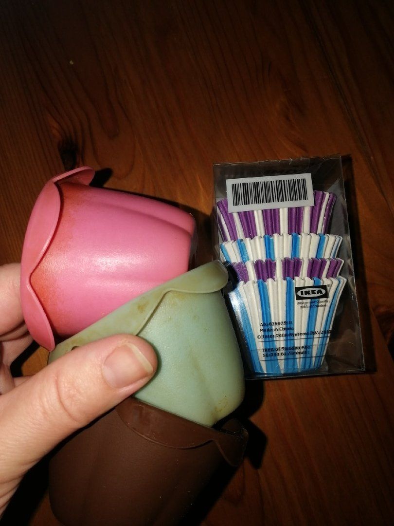 этого теста хватает как раз на 12 икеевских формочек, а в формочки я кладу бумажные — так удобнее