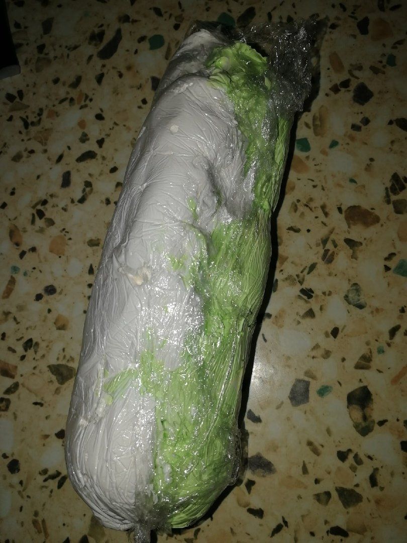 Часть можно покрасить в разные цвета — я в один красила, чтобы было удобнее и ровнее наносить полосатый крем я выкладываю крем на пленку и делаю колбасу — а потом уже в кондитерский мешок