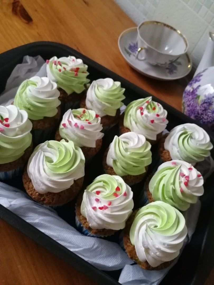 одной порции белкового крема хватит как раз для 12 кексов: 100 гр сахара, 30 мл воды и щепотка лимонной кислоты — это сироп, а один белок — отдлельно