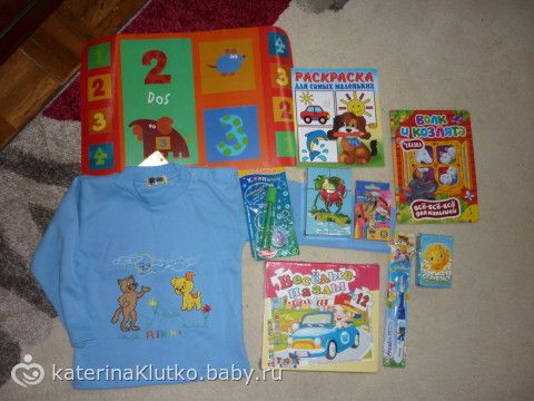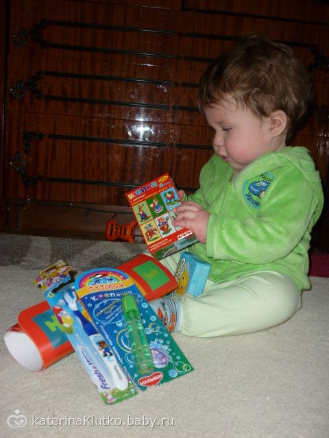 Итак, подведем итог: мыло в виде солнышка, кубики, которые собираеются в картинки, пазлы с большими детельками, кофточка, щетка зубная, мелки восковые, раскраска для самых маленьких, книжка «Волк и семеро козлят», мыльными пузыри и подставка под еду для горячего, веселенькая такая! СПАСИБО!!