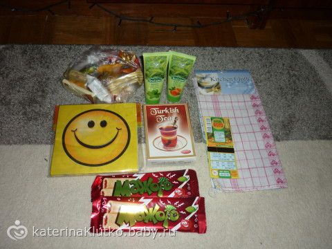 Для нас Юльчик приготовила вот что: пакет с конфетами ( уже сидим с ними чай гоняем, ммм), чай, салфетки-смайлы ( прикольные такие), сладкие батончики (уже схомячили один), кухонные полотенца, мне крем для рук и для ног, а мужу лотерейный билет ( приятная штучка), уже сидим его проверяем, стикер стерли, осталось номера проверить)))! СПАСИБО отдельное и за это