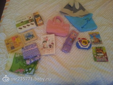 доче красивую сумочку вязанную крючком, колготочки, книжечки и фотоаппарат.Книжечки доча сразу сперла и фотоаппарат… даже нормаль сфотать не получилось...