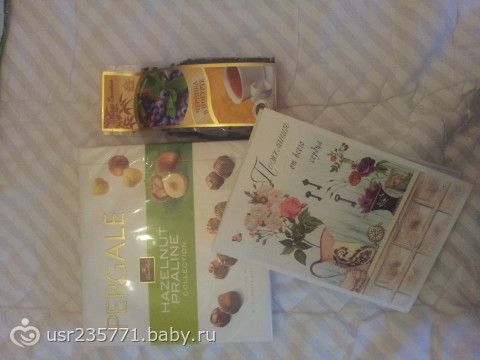 и общее конфетки, но я их распределила к себе, муж к сладкому равнодушен а Сонечка пока их не ест… чай безумно вкусно пахнущий… хочется его съесть ну и открыточка с письмом