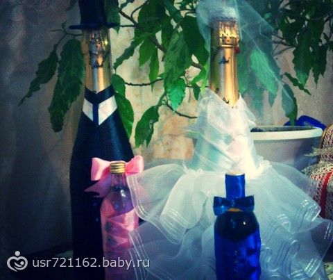 Ну вот моя подруга нам дарила 2 бутылки шампанского одна наряжена как жених, вторая как невеста и 2 маленькие бутылочки коньяка как сынок и дочка
