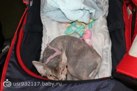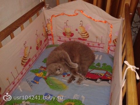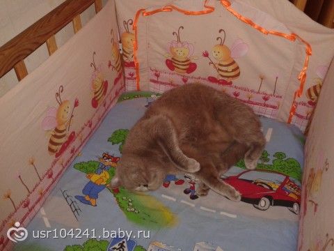 ахах, мы в кроватку кота не пускаем, а вот коляска, любимое местечко))