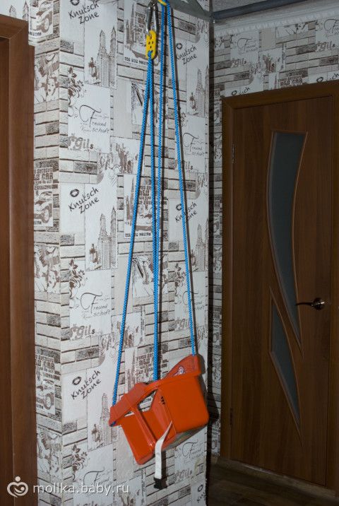 А вот качельку дома любим, качаемся с 7,5 мес. Купили обычную пластиковую, чтобы жесткая перегородка между ножек была. Ремнем не пристегиваем.