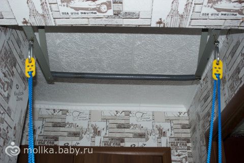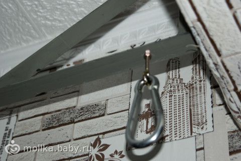 у нас на турнике весят на карабинах. Крепления видно на фото последнем, это желтенькая пласмаска с дырочками