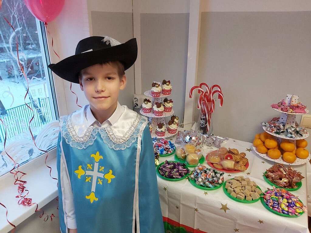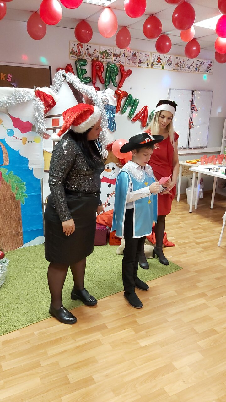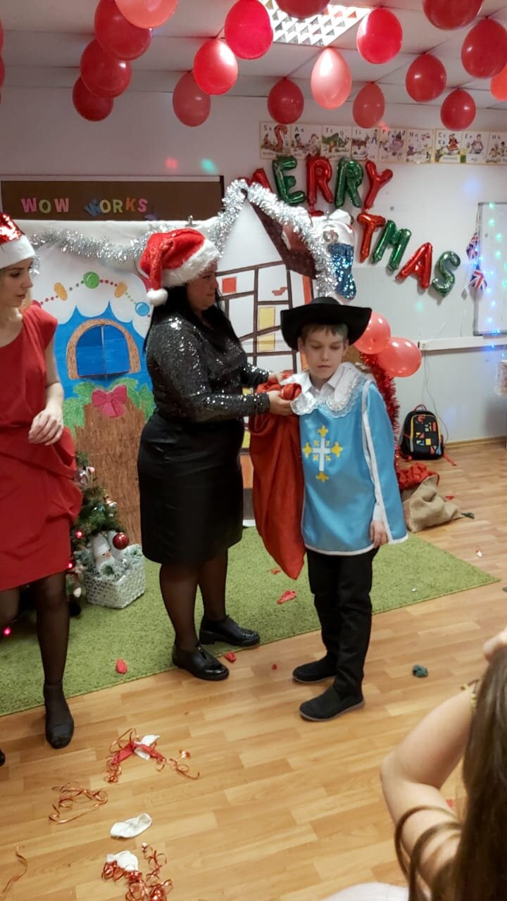 Вечером у Димы был праздник на английском, куда он надел костюм мушкетёра. Было весело, дети искали письма от Санты, выполняли задания.