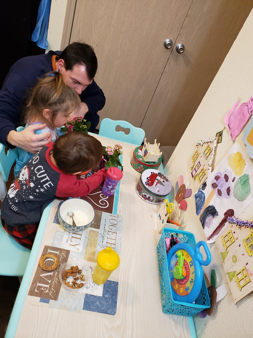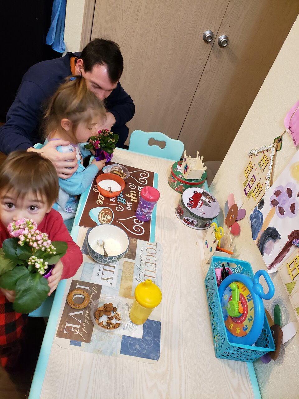 Папа и братик поздравляют дочу с 8 марта)