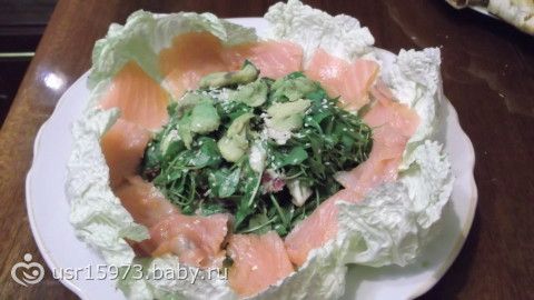 7. Затем на оставшейся части тарелки выкладываем рыбу, как обычно ее раскладывают в России, если бы это была нарезка.