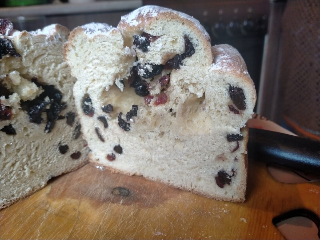 Начинка: может быть любая, у меня — 100 г изюма и 100 г вяленой клюквы. И 100 г сливочного масла для промазки.