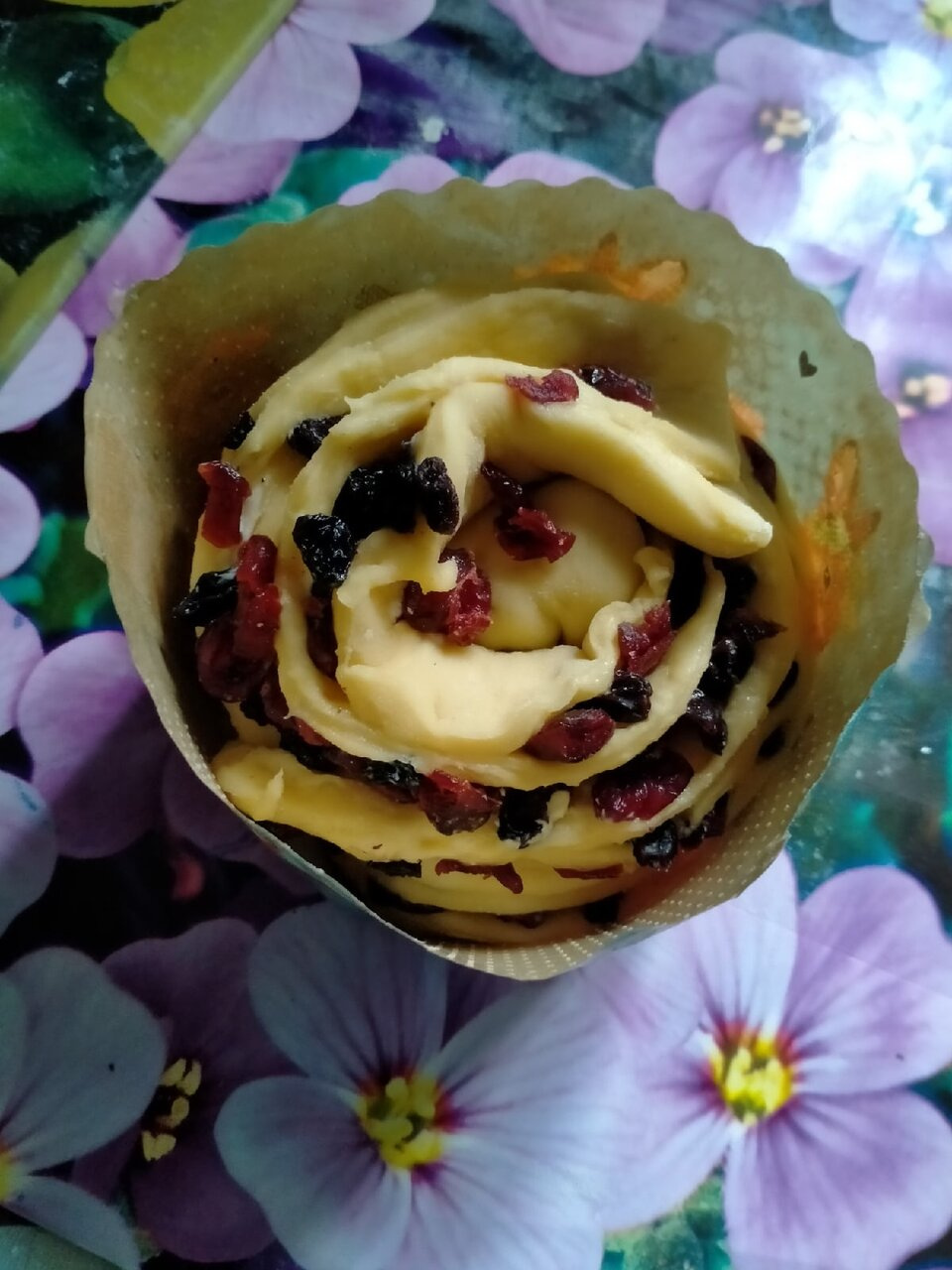 Промазываем прямоугольник обильно, посыпаем клюквой и изюмом и сворачиваем рулетом. Затем рулет разрезаем не до конца по длине и сворачиваем кулич. Помещаем в форму. У меня бумажная. Оставляем расстаиваться минут на 30-40.