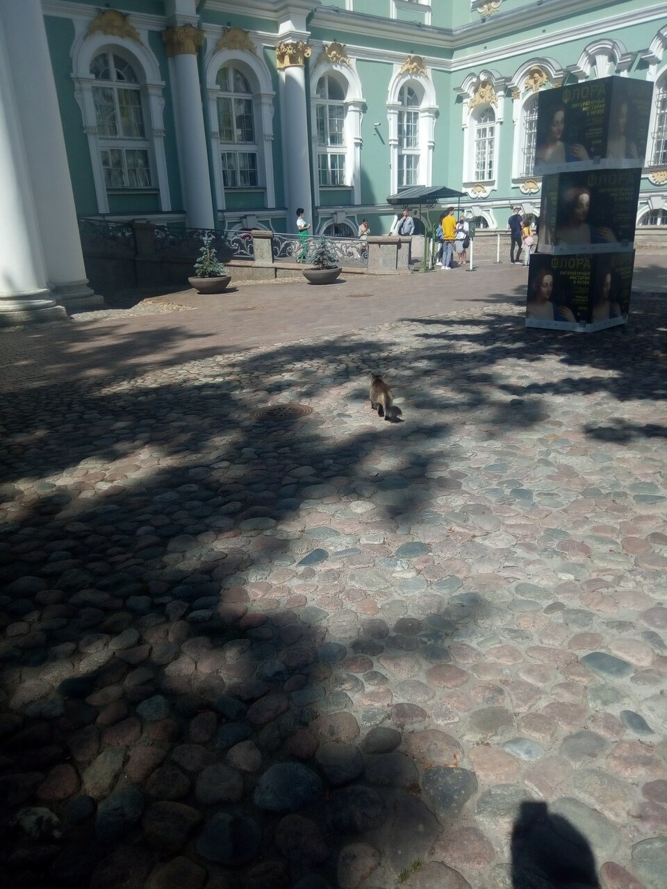 Наиболее известны питерские коты, работающие в Эрмитаже. Они там на довольствии и выполняют важную работу по предохранению фондов от грызунов. Мы встретили парочку «на обходе», во дворе Зимнего дворца.